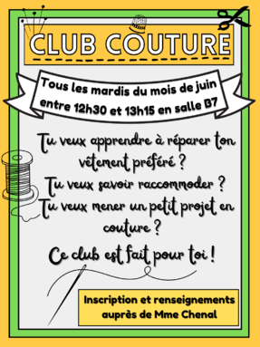 Un club couture aura lieu au collège les quatre mardis midis du mois de juin : il débutera le mardi 4 juin, entre 12h30 et 13h15. Projet mené par Mme Chenal, plus d'infos en cliquant sur la publication !